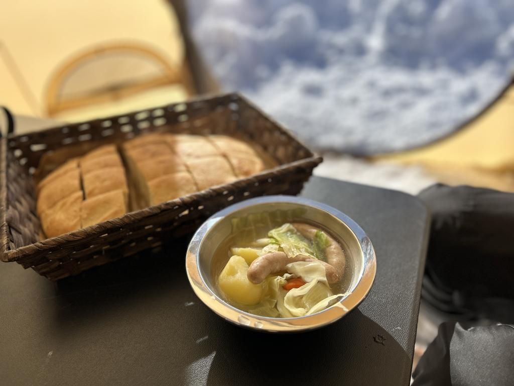 雪をかきわけ、雪の下から掘り起こしたキャベツを試食!スノーピクニックでは温かいポトフをご提供します!
